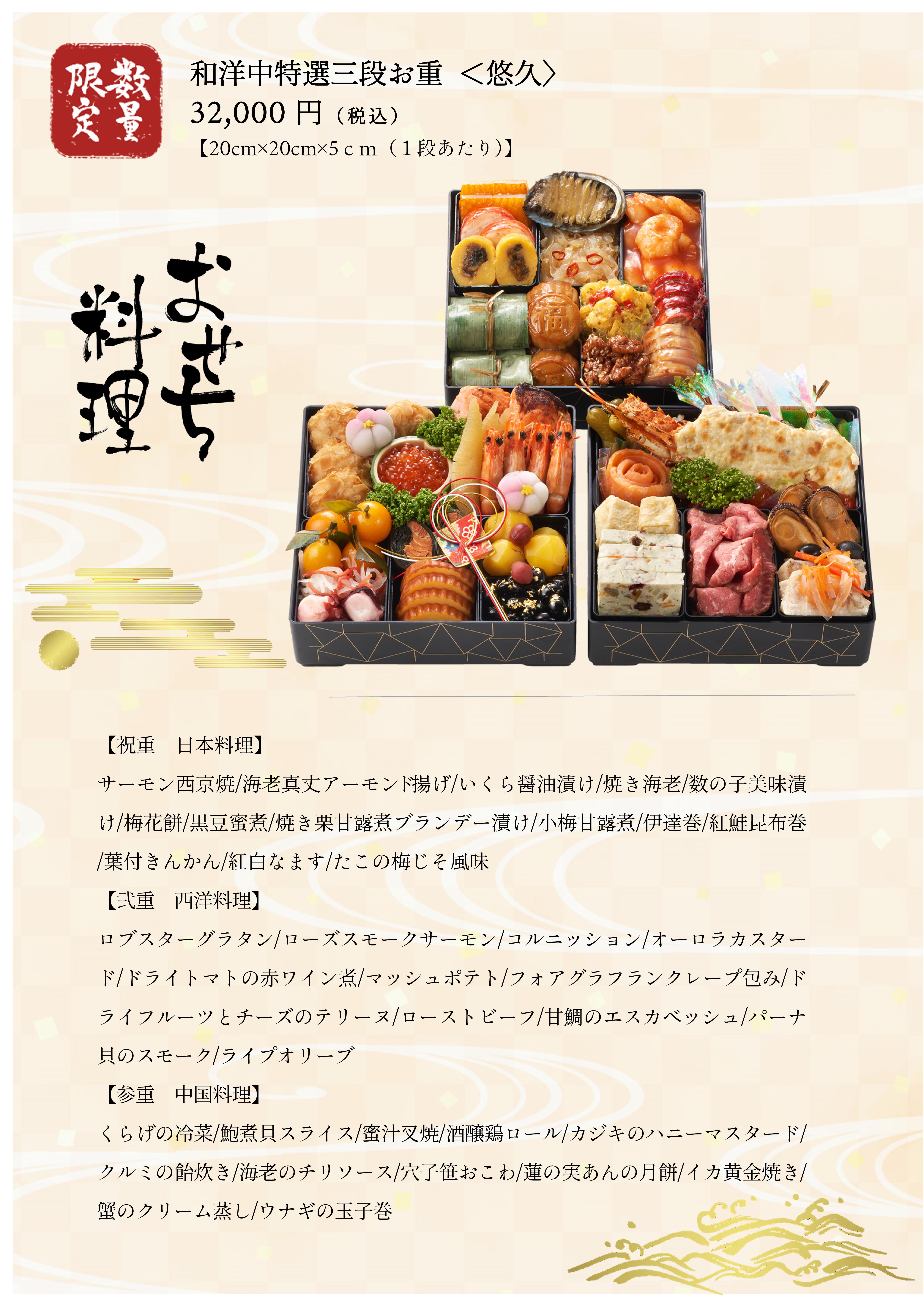 - 【悠久】和洋中特選三段お重・・・・32,000円 メニュー内容