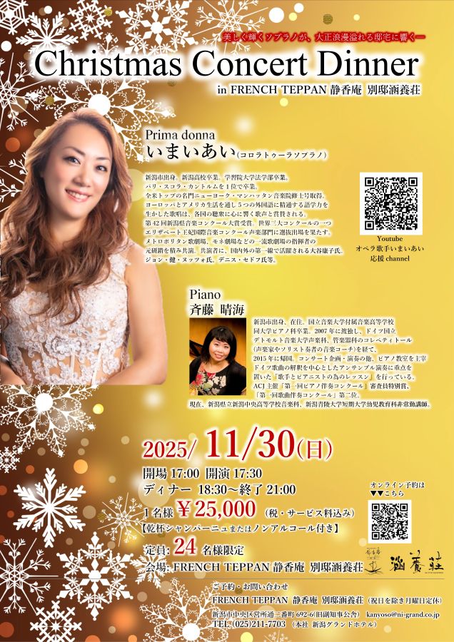 金額 | お一人様/25,000円(税・サービス料込) 内容:コンサート鑑賞・別邸涵養荘ディナーコース・乾杯シャンパーニュまたはノンアルコール >パンフレットはこちら |
