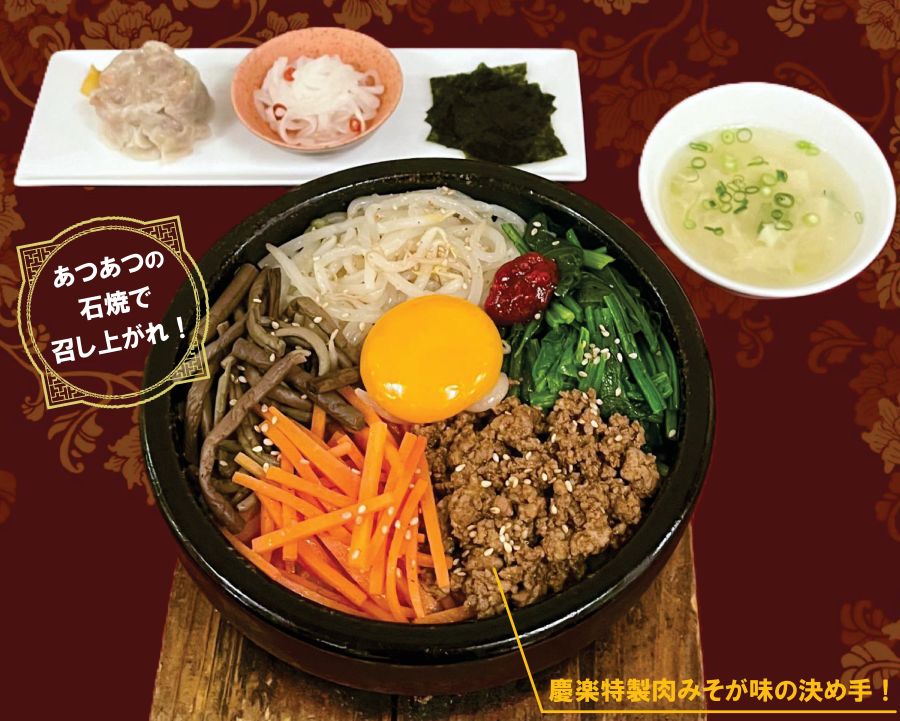 | メニュー | 石焼フェアに新しい味が新登場! 慶楽オリジナルの自家製肉味噌が味の決め手です。 ●慶楽自家製焼売と、うれしいトッピング&スープ 付き 〈大根の甘酢漬け・韓国のり・コチュジャン〉 |