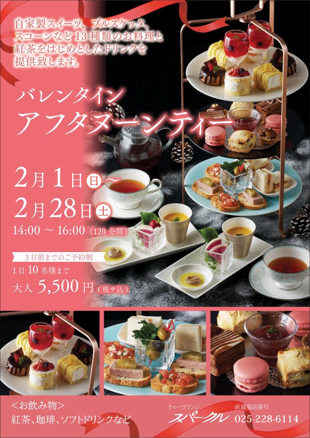 | 内容 | 自家製スイーツ、ブルスケッタ、スコーンなど 13種類のお料理と紅茶をはじめとしたドリンクを提供致します。 <お飲み物> 紅茶、珈琲、ソフトドリンクなど |
