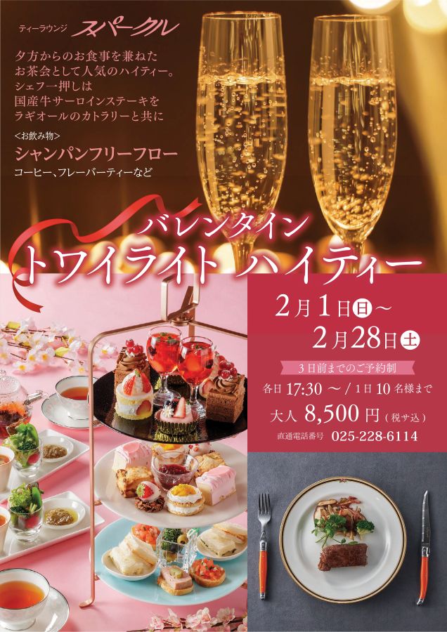 | 内容 | 夕方からのお食事を兼ねたお茶会として人気のハイティー。 シェフ一押しは国産牛サーロインステーキをラギオールのカトラリーと共に <お飲み物> シャンパンフリーフロー、コーヒー、フレーバーティーなど |